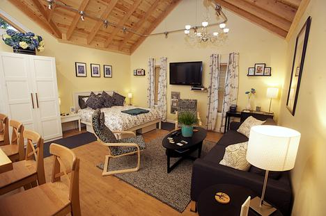 Trädhuset (Swedish for "the tree house") is a spacious and luxurious studio apartment, located on the second floor of a carriage house in downtown Lindsborg, Kansas. Trädhuset features living/sleeping area, fully equipped kitchen, sumptuous bathroom with a large shower and double sinks plus full-size, high-efficiency washer and dryer. In keeping with the community's Swedish heritage, you'll find the apartment equipped with IKEA furnishings and appliances.